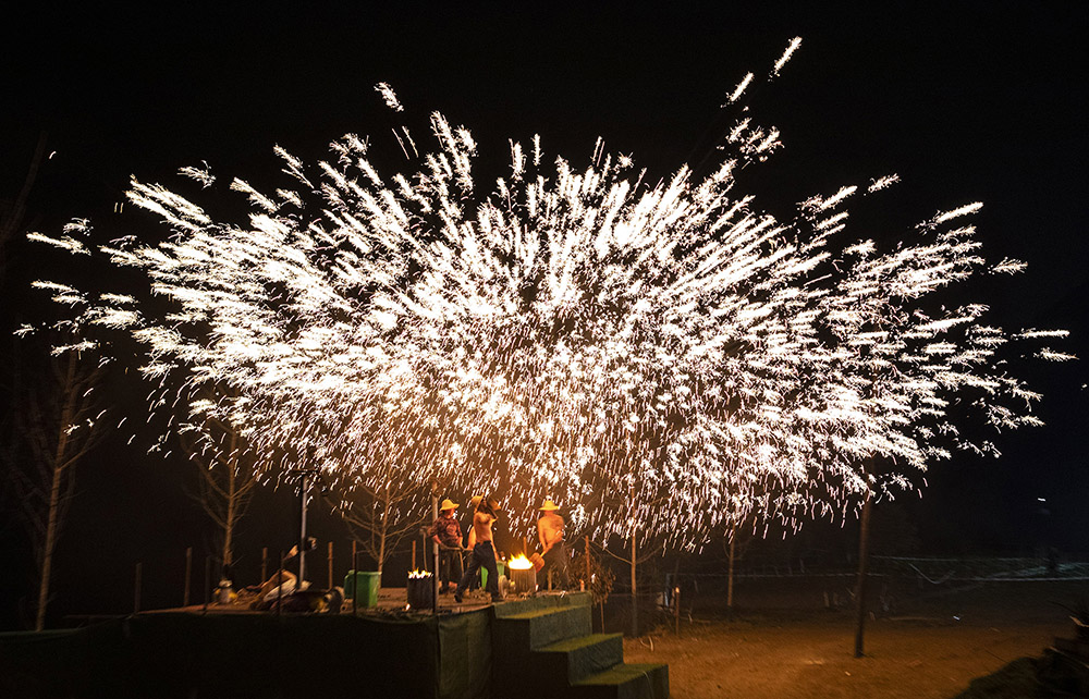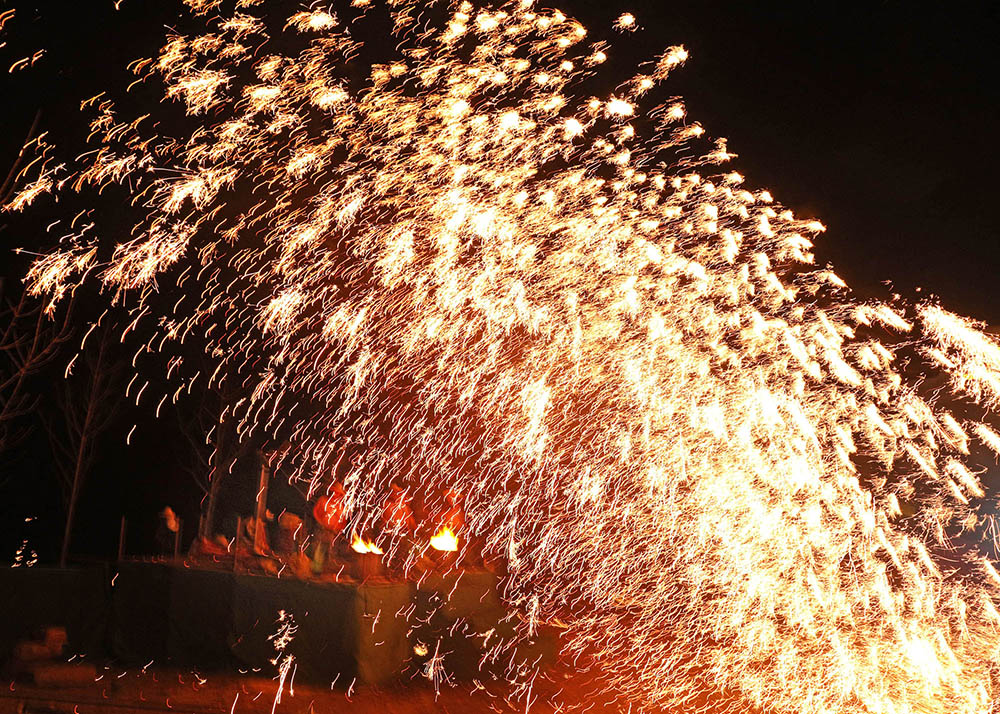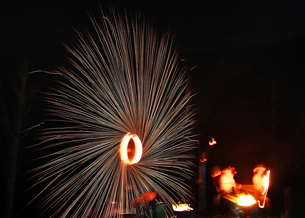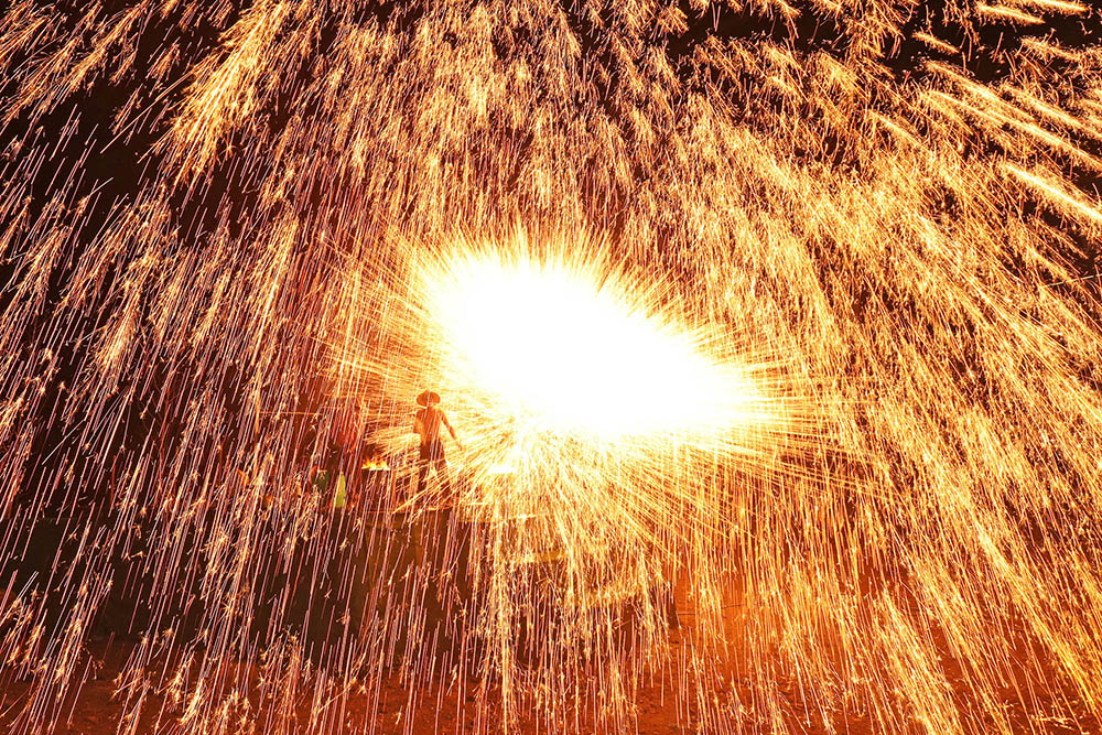 打铁花,要用熔炉将铁汁升至1600度高温,表演者轮番用拍子把铁汁击打到空中,形成十几米高的铁花。不同的手法、不同的角度、不同的用力,能打出千姿百态的铁花。从拍子击打铁汁的那一瞬间,铁汁仿如顷刻暴发的巨大的金色喷泉,冲向天空,幻化出无数飞舞的流星、奇丽的花朵、飘动的金丝……它那灿烂夺目、变幻无穷的光影,除了让游客惊奇与刺激,更带给了人们无比的愉悦和美的享受。(邵义龙 摄影报道)