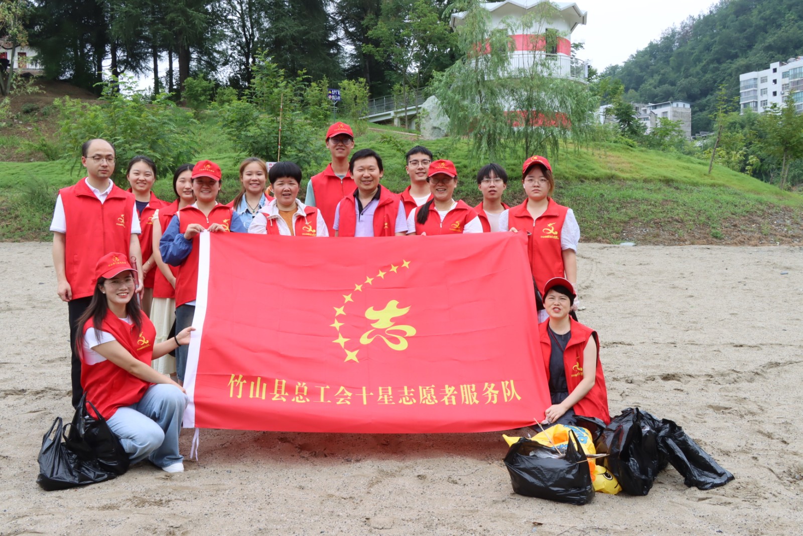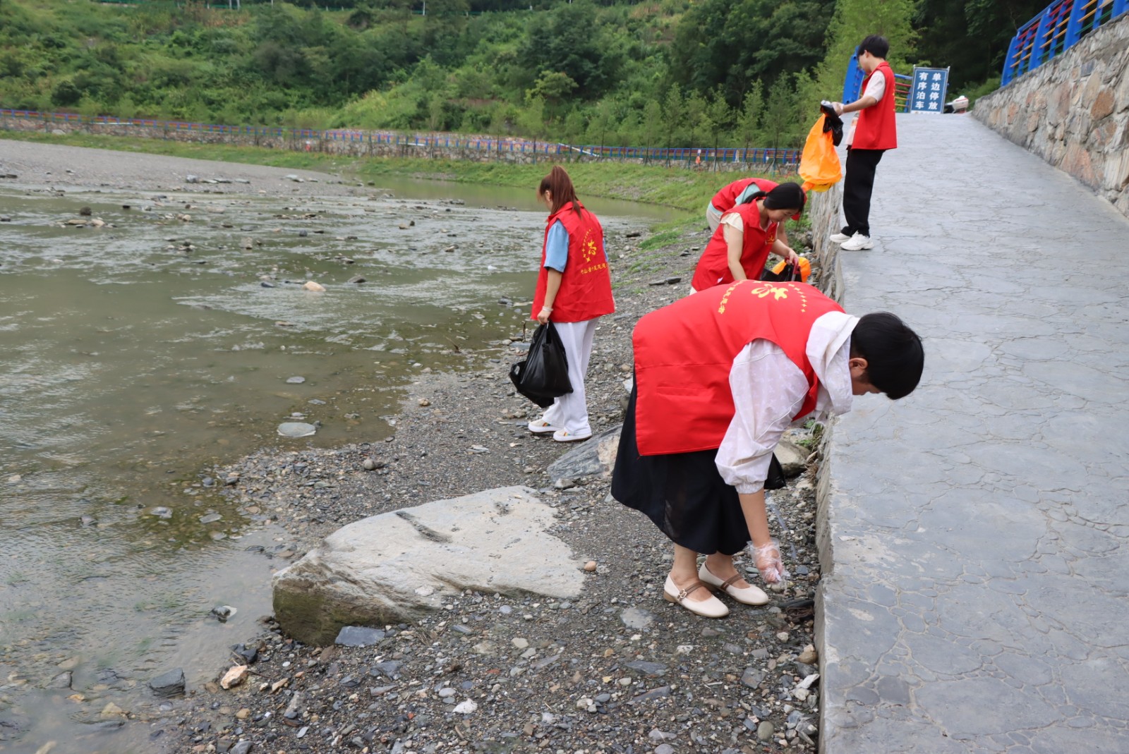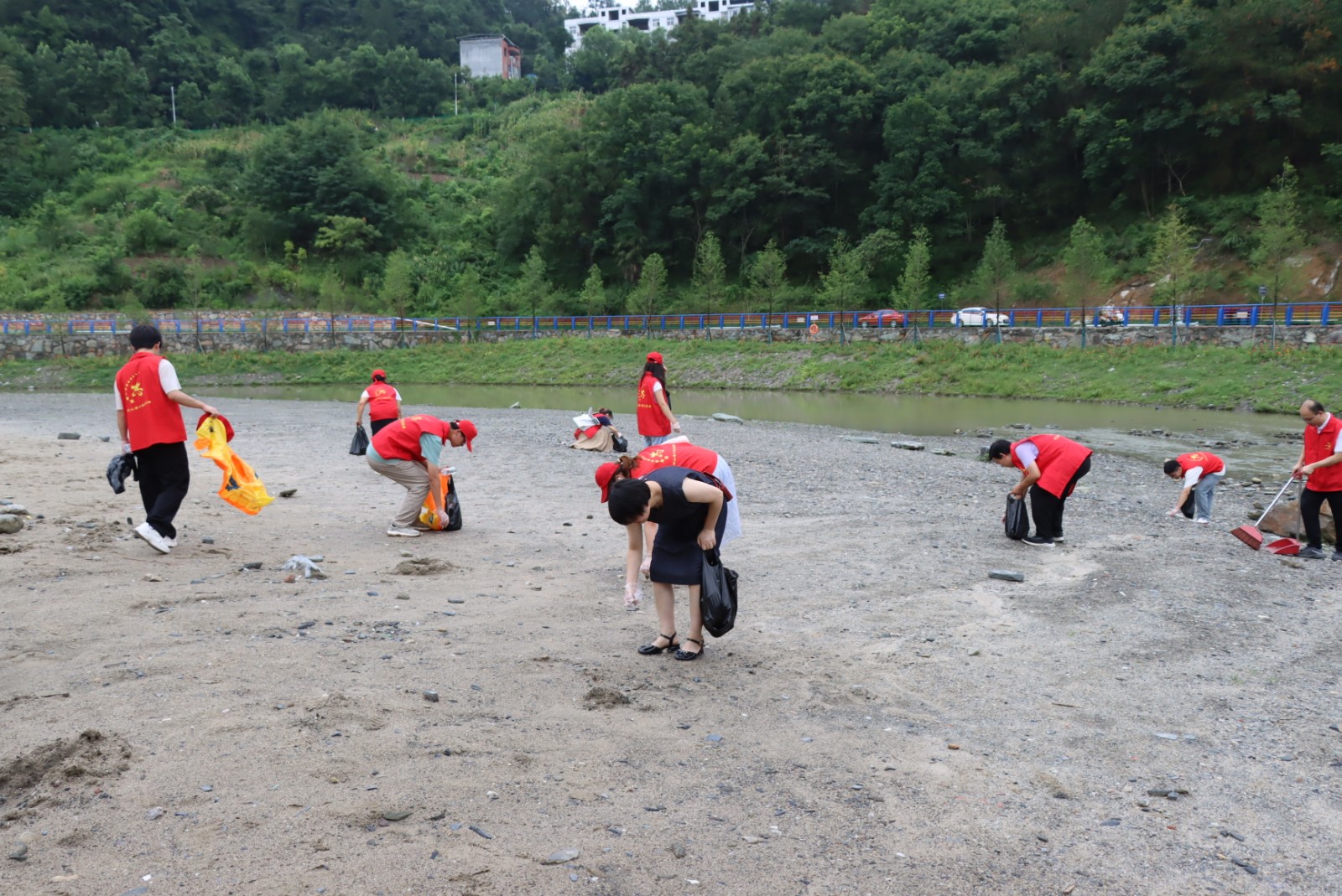 桃花湾因其风景秀丽、河风怡人,且距主城区仅5分钟路程,成为周边居民休闲纳凉的热门去处,每天傍晚都有数百名群众过来休憩,保持洁净的河畔环境尤为重要。活动中,志愿者们身着红马甲,手持扫帚、垃圾袋等工具,三两成组沿着沙滩有序开展清洁。大家分工协作,有的俯身捡拾塑料瓶、包装袋等生活垃圾,有的仔细清理隐藏在草丛、石缝中的烟头。阳光下,“志愿红”穿梭于河畔,成为桃花湾一道亮丽的风景线。经过一个多小时的辛勤劳动,沿岸及沙滩上的垃圾被集中清理,环境焕然一新。
